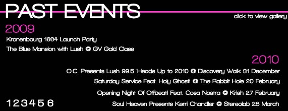 The Blue Mansion with Lush The Blue Mansion with Lush Kronenbourg 1664 Launch Party Kronenbourg 1664 Launch Party Heads Up to 2010 Heads Up to 2010 Holy Ghost @ The Rabbit Hole Holy Ghost! @ The Rabbit Hole Lush @ Krish Lush @ Krish Kerri Chandler @ Stereolab Kerri Chandler @ Stereolab